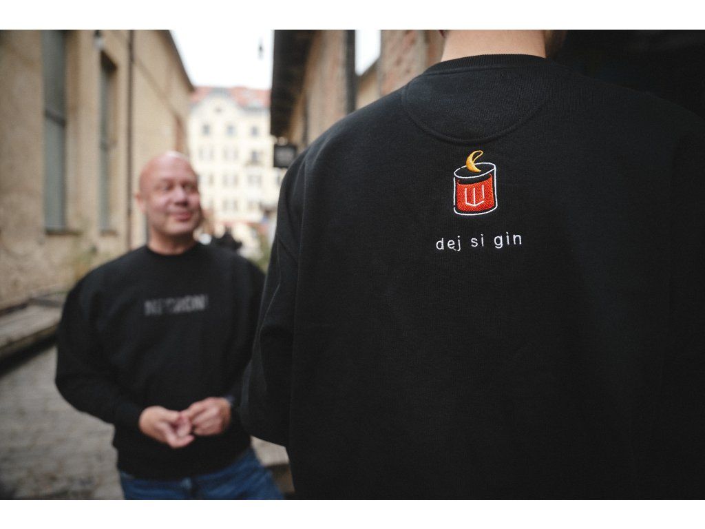 Na hrudi najdeš decentní nápis NEGRONI, na zádech pak výšivku koktejlu s textem „Dej si gin“ — jednoduchý detail, ale jasný statement.